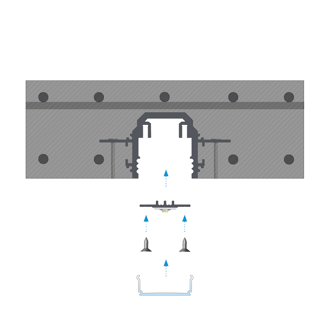 Montageanleitung für das DURO M1 Montageprofil mit der LIFT ONE Abdeckung unter Verwendung von Schrauben.