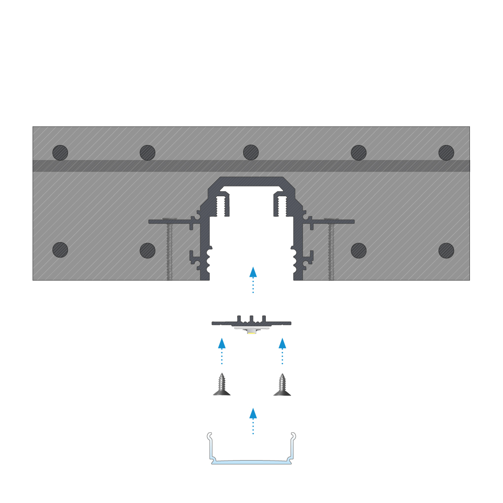 Montageanleitung für das LED-Profil DURO in der Schalung mit Schrauben.
