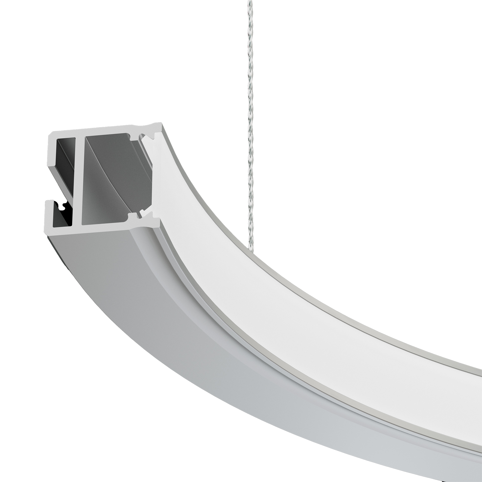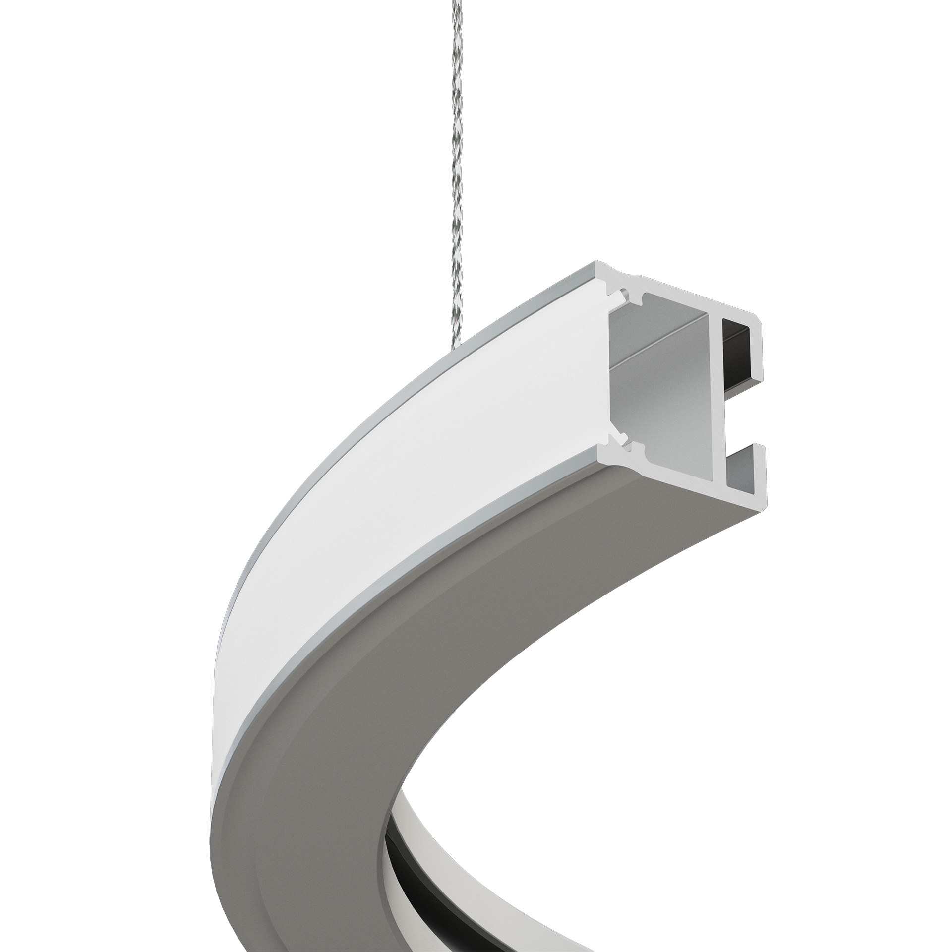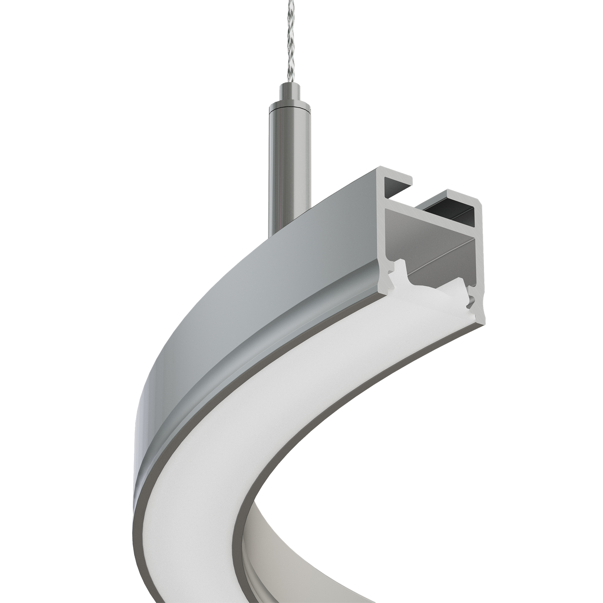 Spezial-LED-Profil für die Oberflächenmontage, das für das Biegen in beiden Ebenen entwickelt wurde. Es ermöglicht die Erstellung durchgehender, gekrümmter Lichtlinien, die präzise an die Geometrie architektonischer Formen angepasst sind, ohne die mechanischen, optischen oder ästhetischen Eigenschaften der Leuchte zu beeinträchtigen. Das System sieht die Verwendung von Verbindungsstücken und eine hängende Montage vor, was eine hohe Flexibilität bei der Konfiguration und eine einfache Integration in verschiedene Arten von Räumen gewährleistet.