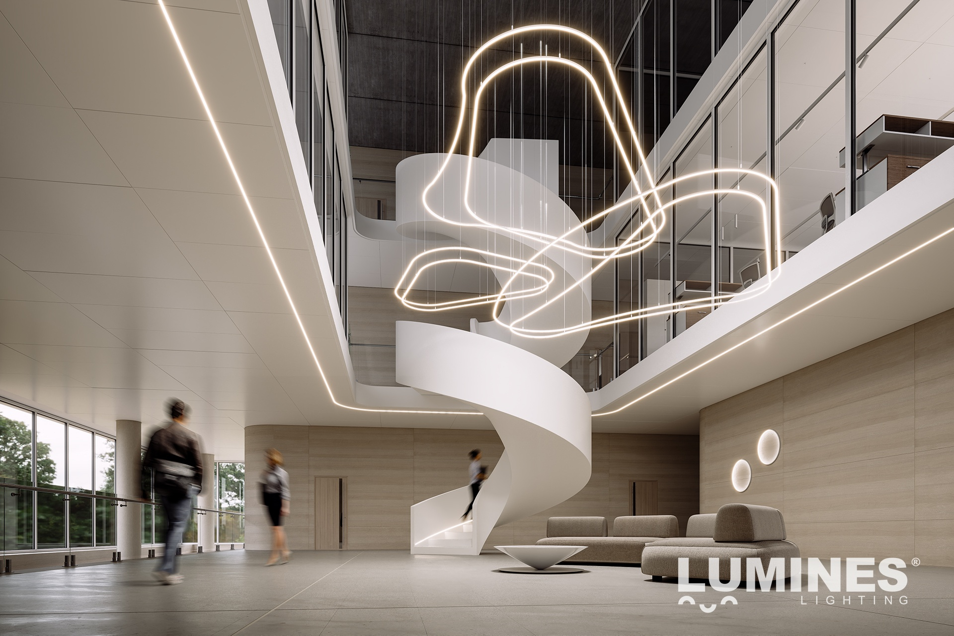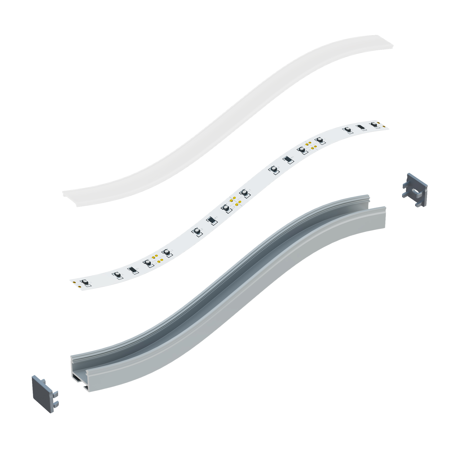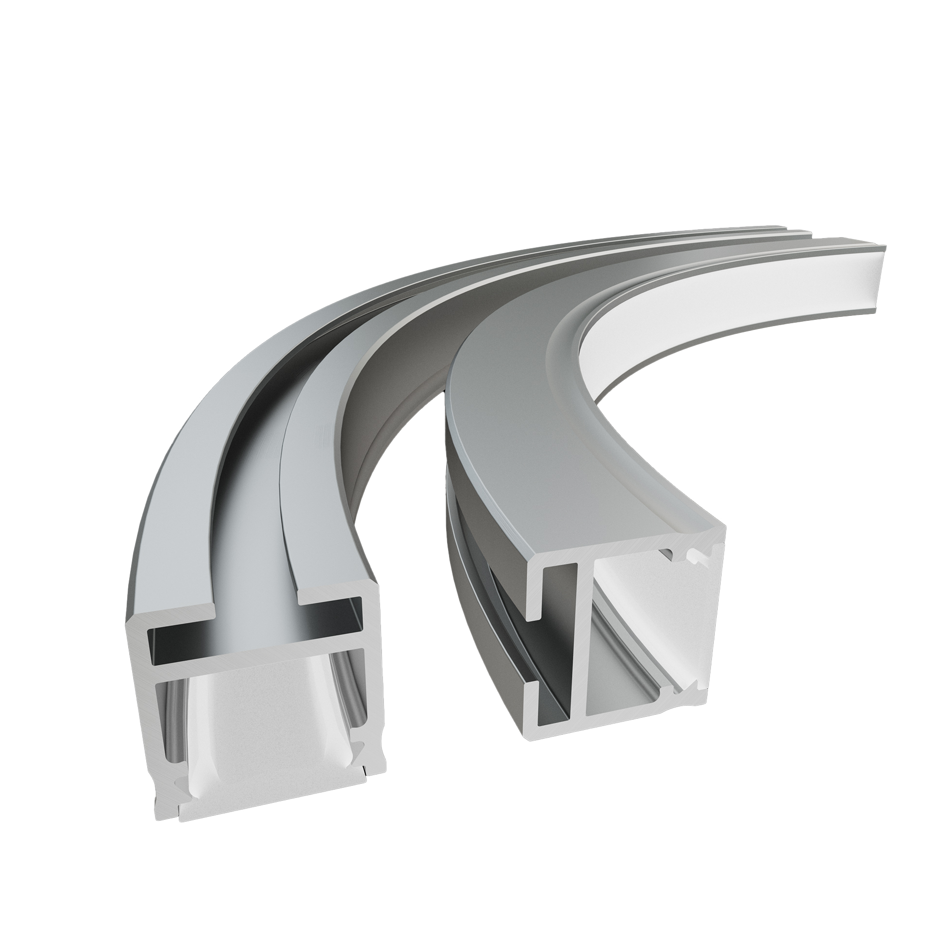 Spezial-LED-Profil für die Oberflächenmontage, das für das Biegen in beiden Ebenen entwickelt wurde. Es ermöglicht die Erstellung durchgehender, gekrümmter Lichtlinien, die präzise an die Geometrie architektonischer Formen angepasst sind, ohne die mechanischen, optischen oder ästhetischen Eigenschaften der Leuchte zu beeinträchtigen. Das System sieht die Verwendung von Verbindungsstücken und eine hängende Montage vor, was eine hohe Flexibilität bei der Konfiguration und eine einfache Integration in verschiedene Arten von Räumen gewährleistet.