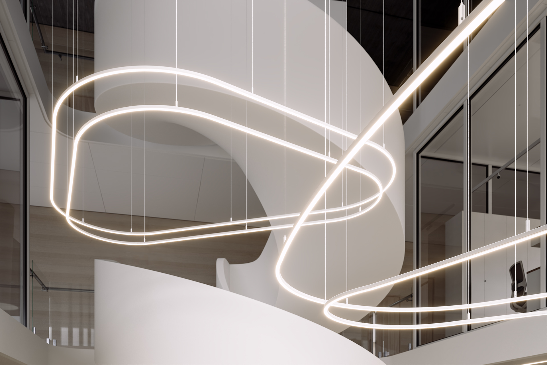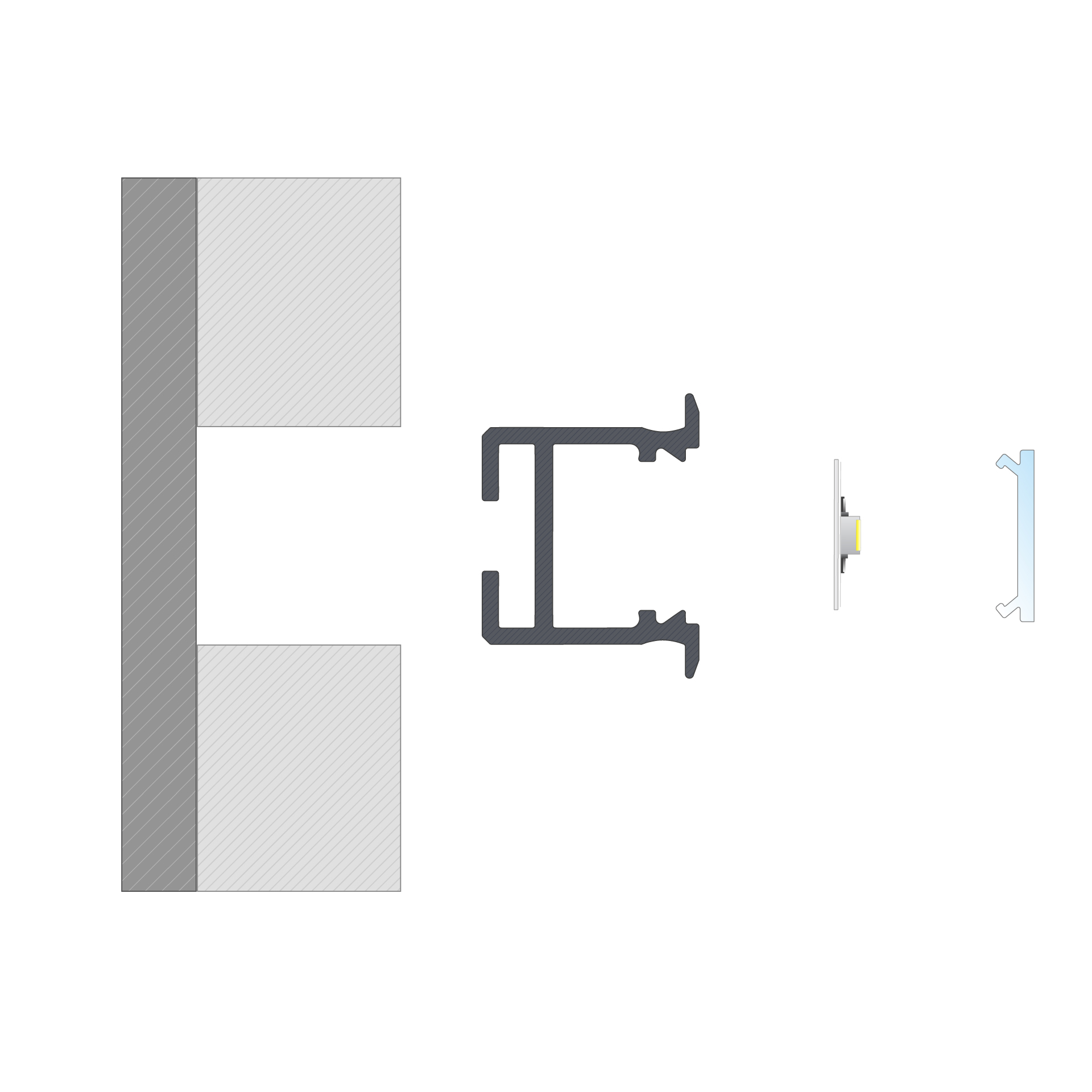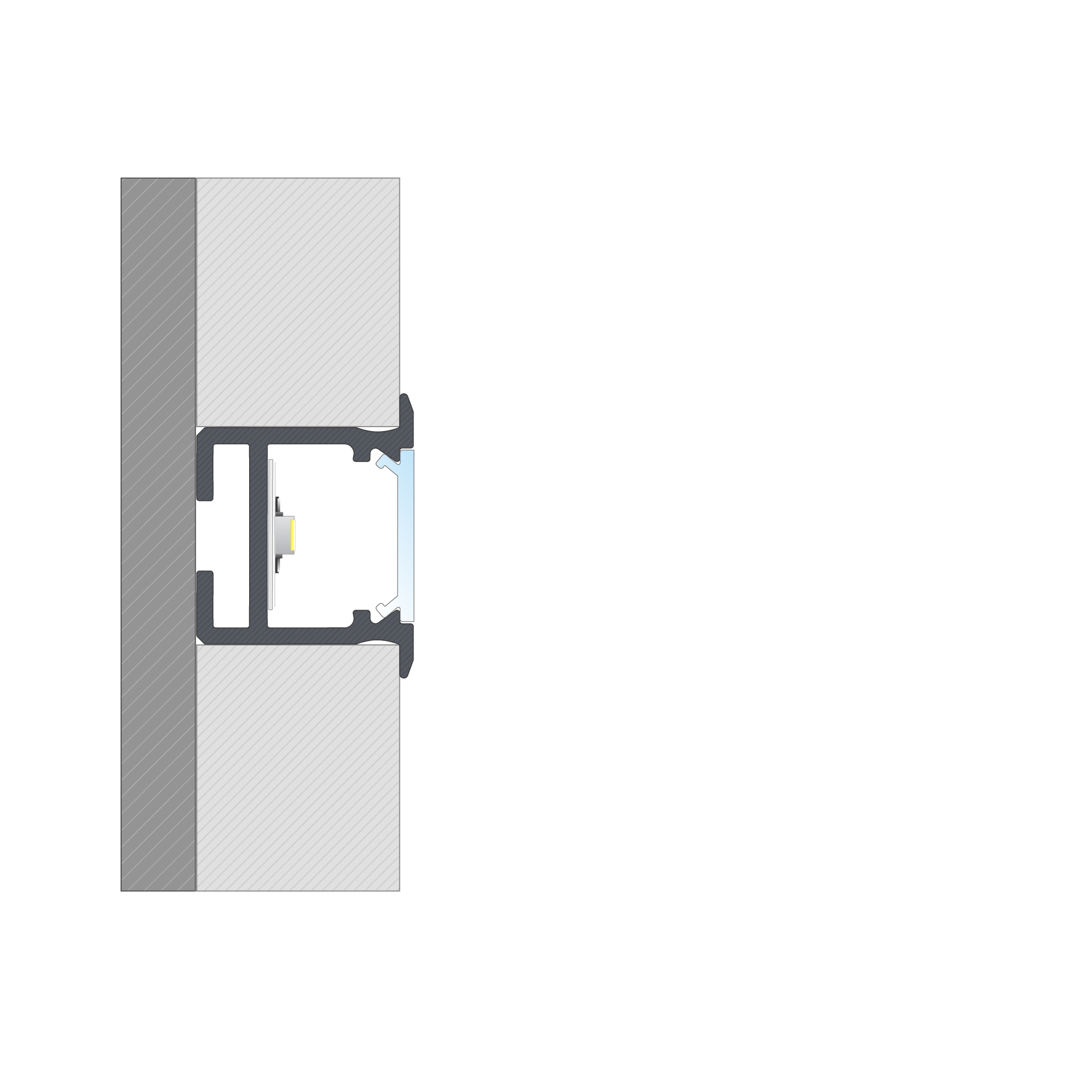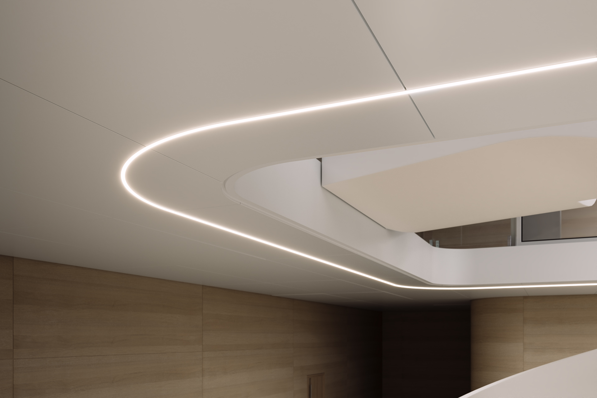 Einbauversion des FLEXA-Systems. Ermöglicht die Erstellung glatter, durchgehender Lichtlinien, die bündig mit der Decken- oder Wandoberfläche abschließen, einschließlich gekrümmter Abschnitte. Das System unterstützt Verbindungsstücke, wodurch komplexe Beleuchtungssysteme erstellt werden können, und eignet sich besonders gut für die Realisierung von Lichtbögen in Wänden und auf Säulen.