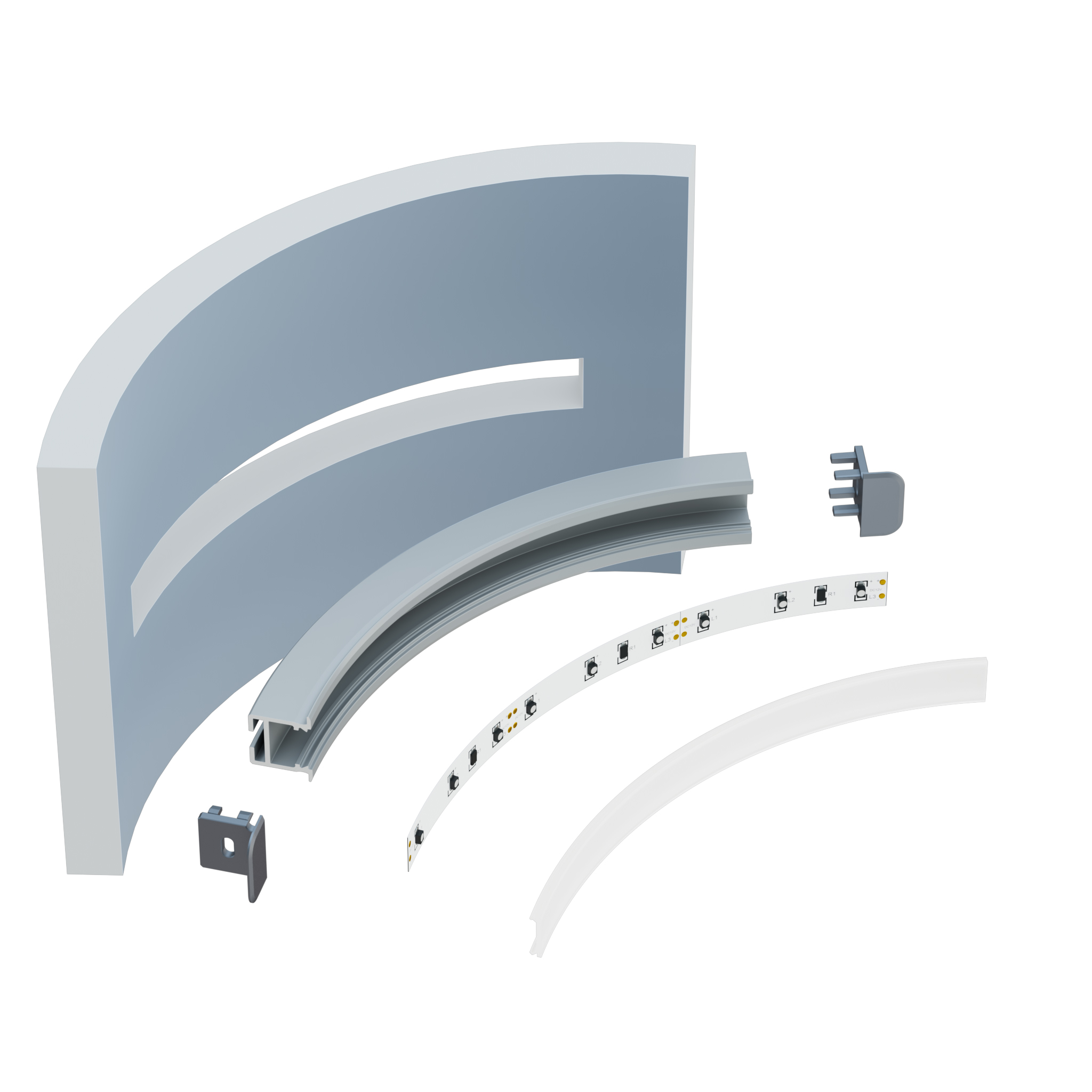 Montageschema der Beleuchtungssystemelemente unter Verwendung des vertikal gebogenen inFLEXA-Profils (Lichtrichtung: nach innen), des BASIC-Lampenschirms, des LED-Streifens und der Endkappen