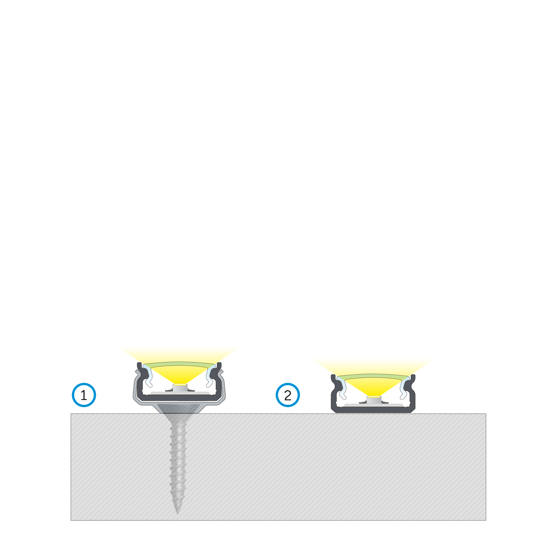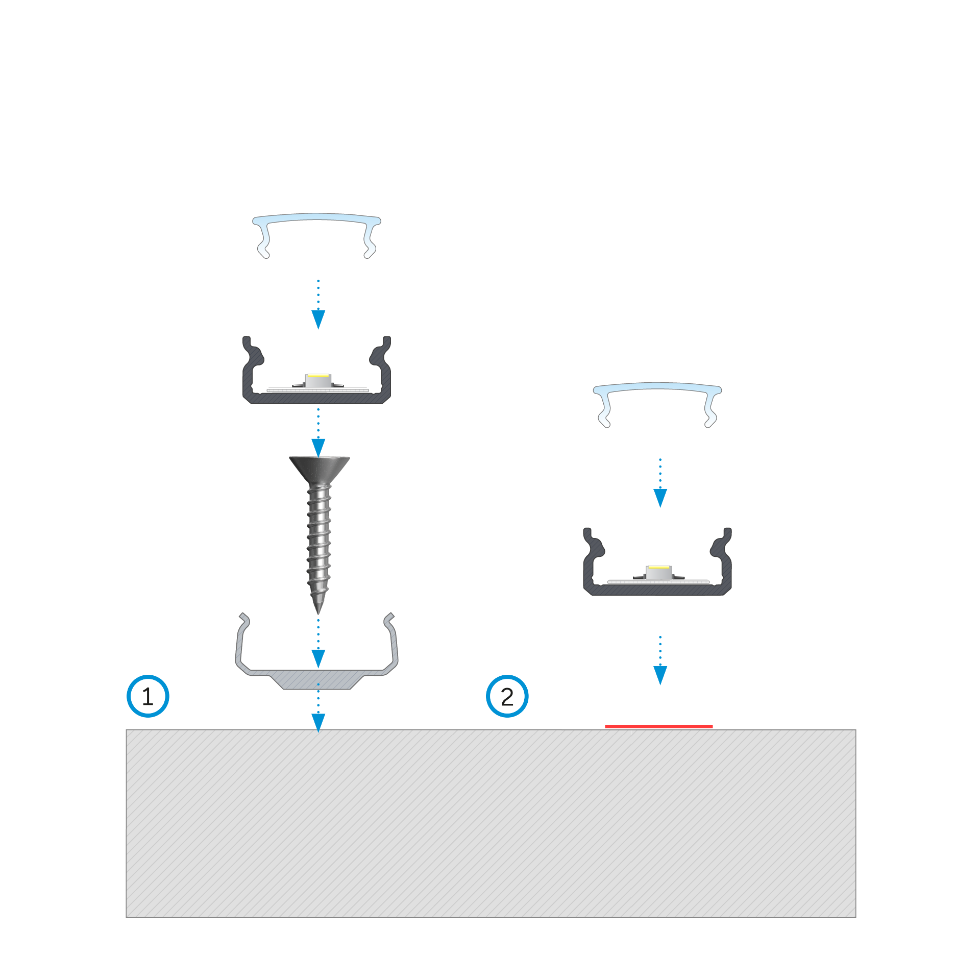 Montageanleitung für das ONI-Profil mit LEAN-Abdeckung unter Verwendung von (1) Montagehalterung, (2) doppelseitigem Klebeband.