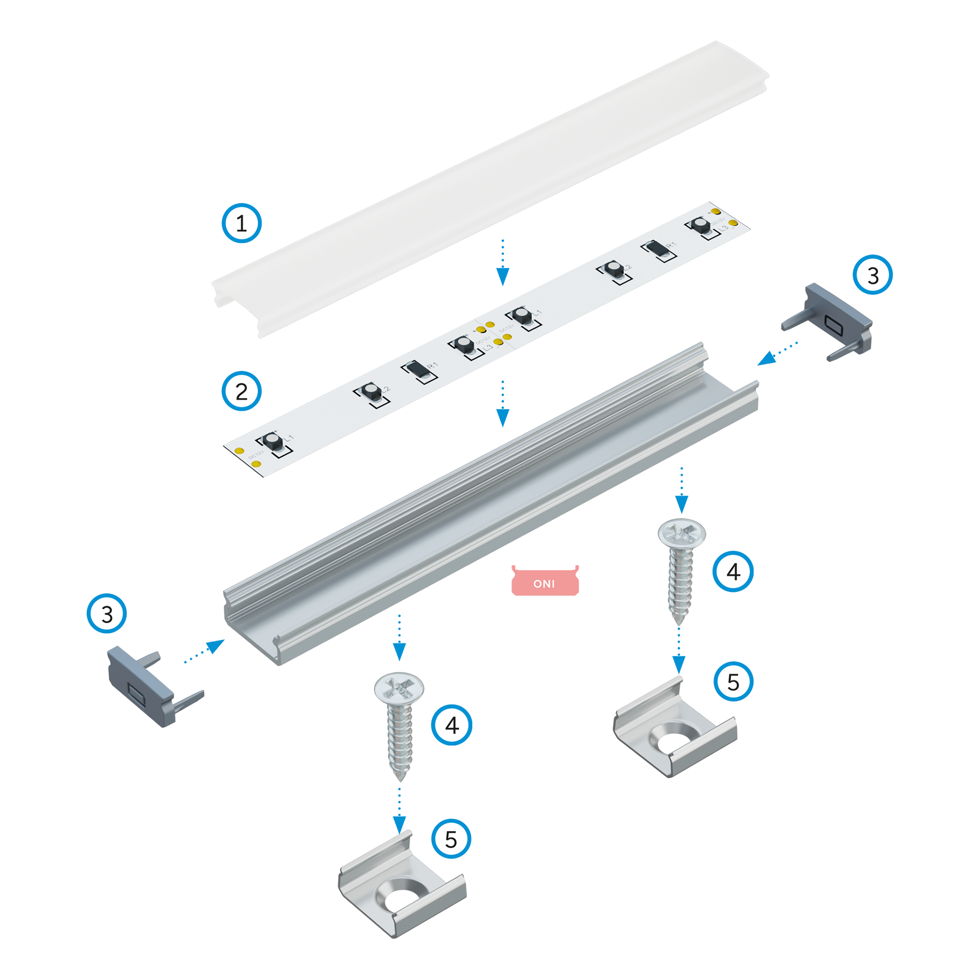 Montageplan der Beleuchtungssystemelemente unter Verwendung des ONI-Profils und (1) LEAN-Lampenschirm, (2) LED-Streifen, (3) Endkappen, (4) Schrauben, (5) Montagehalterungen.
