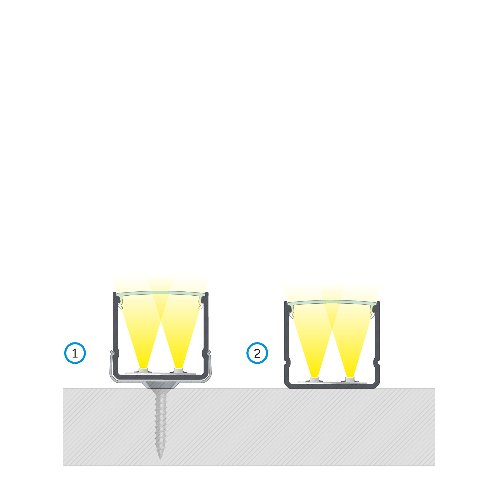 Das Endergebnis der Installation des RAI-Profils mit einer COMPACT-Abdeckung unter Verwendung von (1) Montagehalterung, (2) doppelseitigem Klebeband.