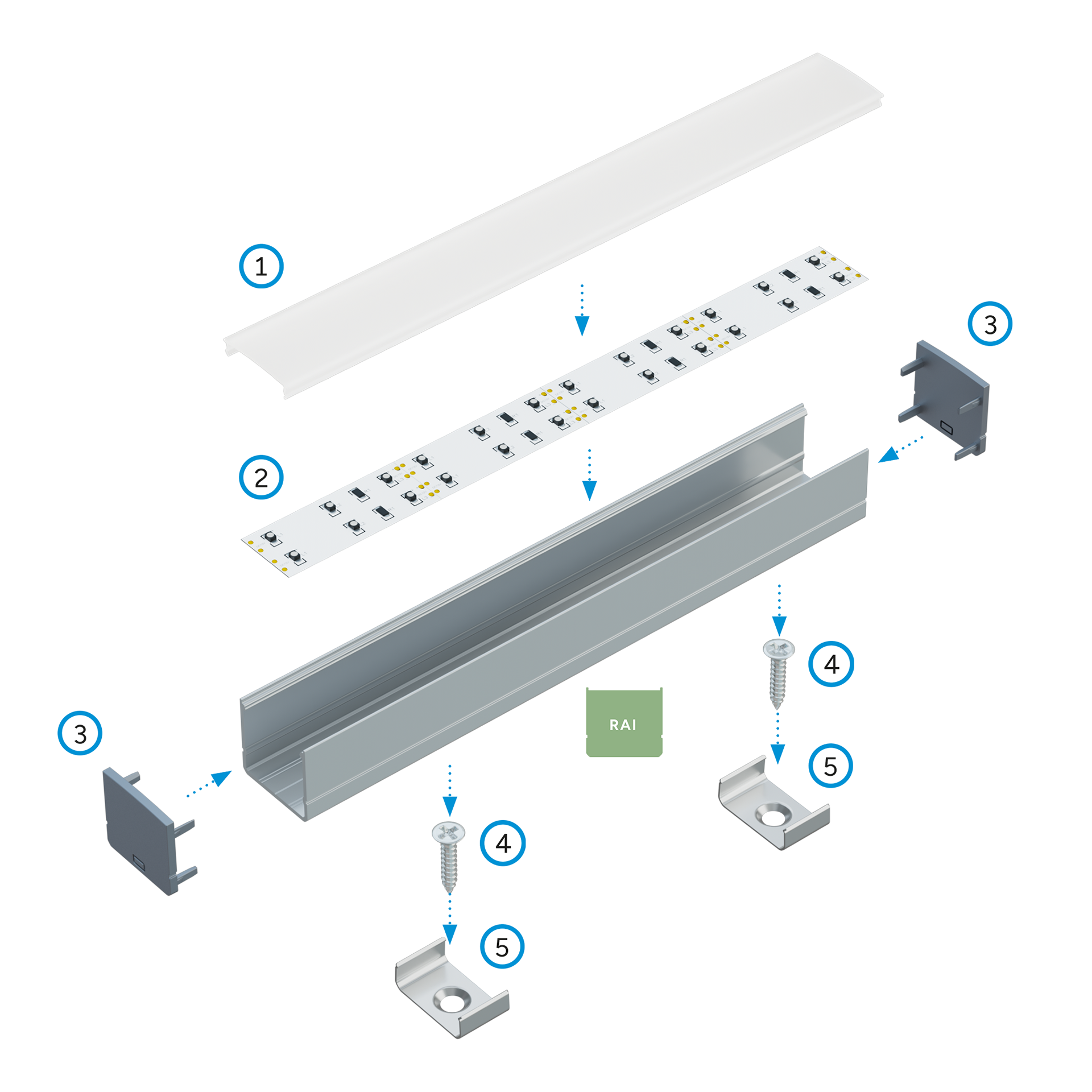 Montageplan der Beleuchtungssystemelemente unter Verwendung des RAI-Profils und (1) COMPACT-Abdeckung, (2) zwei LED-Streifen, (3) Endkappen, (4) Schrauben, (5) Montagehalterungen.