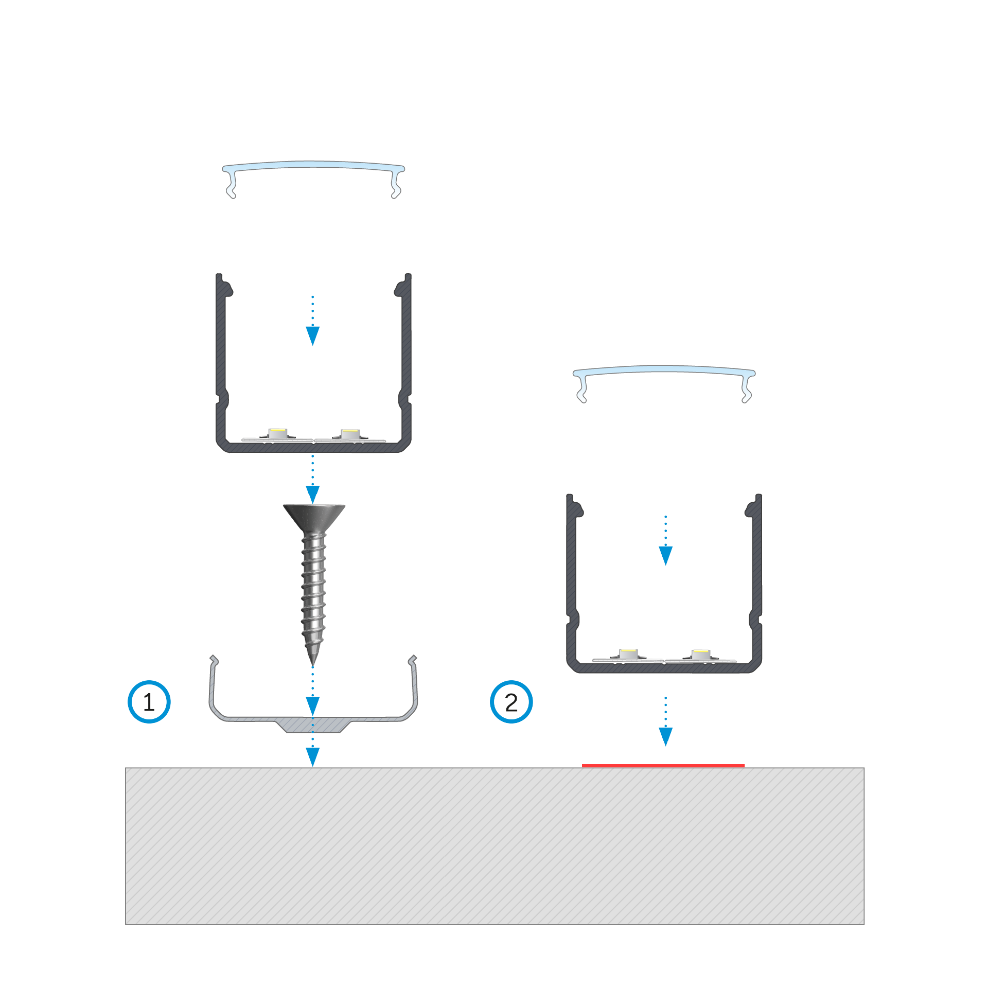 Montageanleitung für das RAI-Profil mit COMPACT-Abdeckung unter Verwendung von (1) Montagehalterung, (2) doppelseitigem Klebeband.
