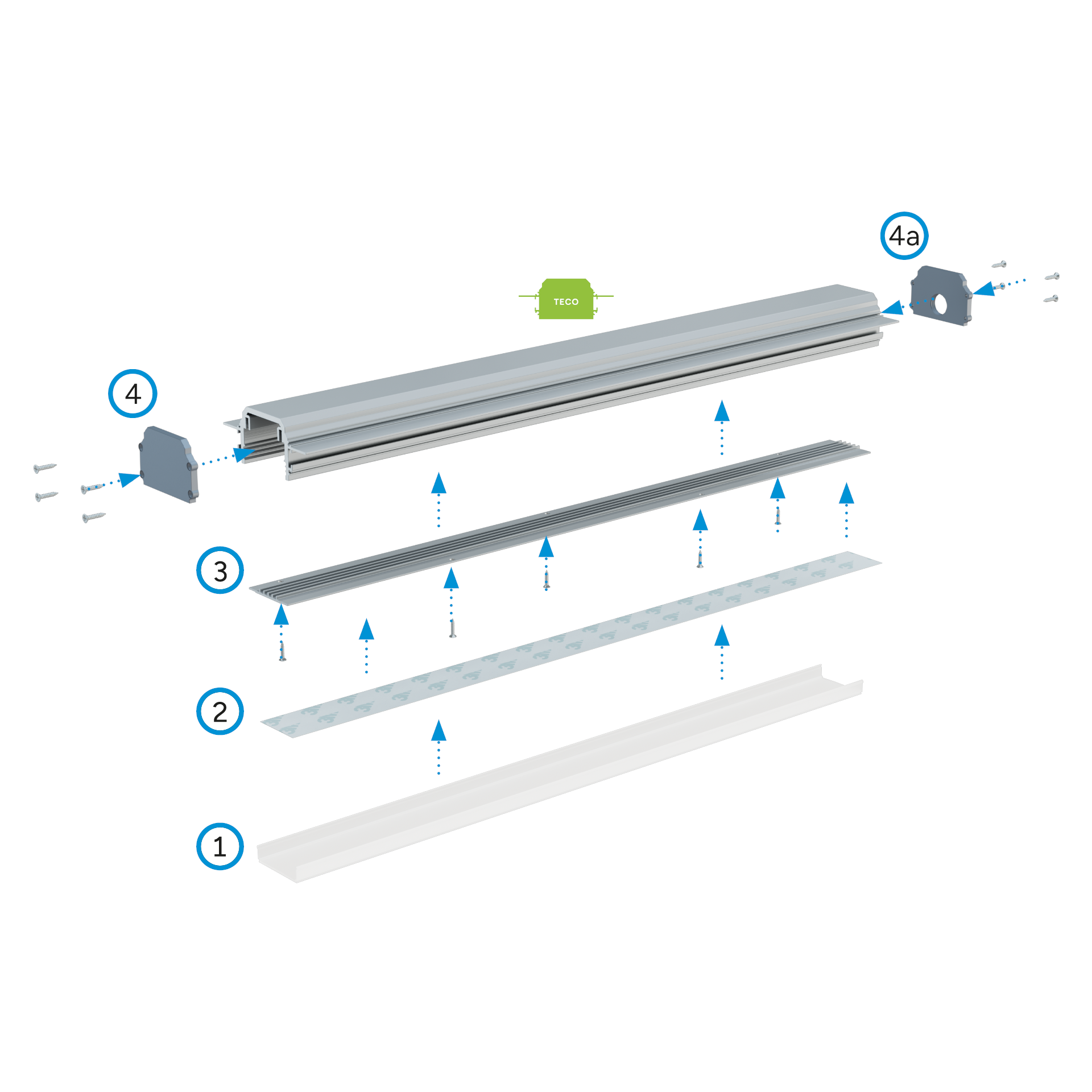 Montageschema der Elemente des Beleuchtungssystems unter Verwendung des TECO-Profils sowie (1) LIFT TWO-Abdeckung, (2) zwei LED-Streifen, (3) Montageprofil TECO M1, (4) TECO-Endkappe ohne Öffnung, (4a) TECO-Endkappe mit Öffnung.