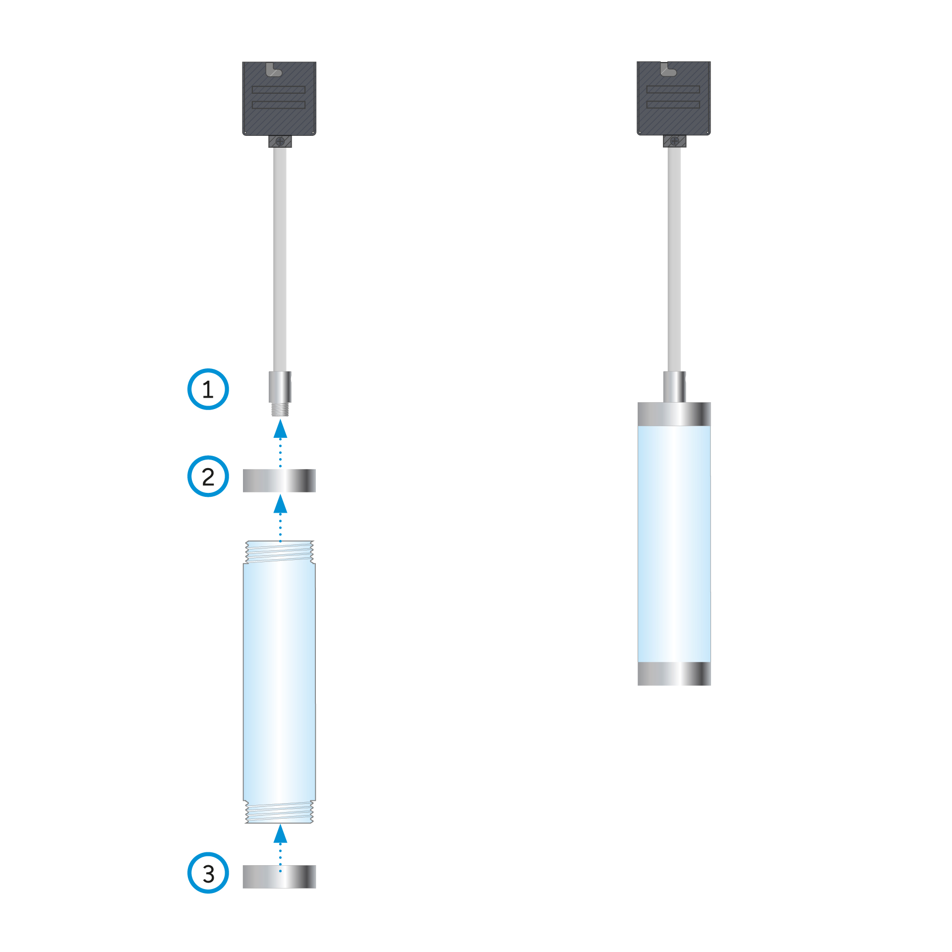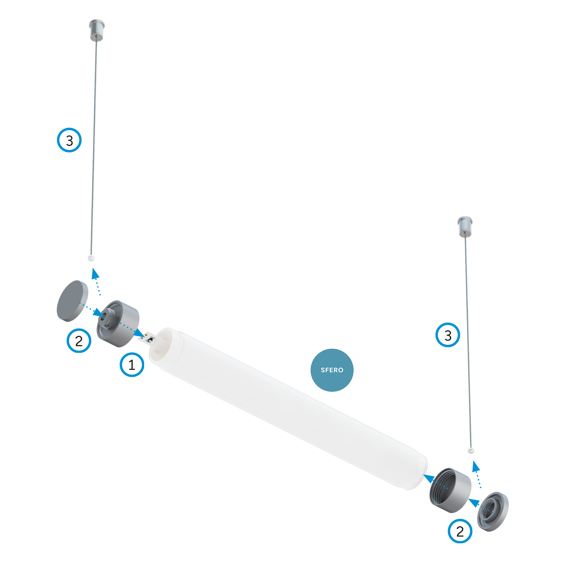 Montageschema des Beleuchtungssystems unter Verwendung des SFERO LED-Profils sowie: (1) SFERO FLEX Lichtquelle, (2) zweiteilige SFERO MS2 Endkappen ohne Öffnung, (3) Abhängesets.