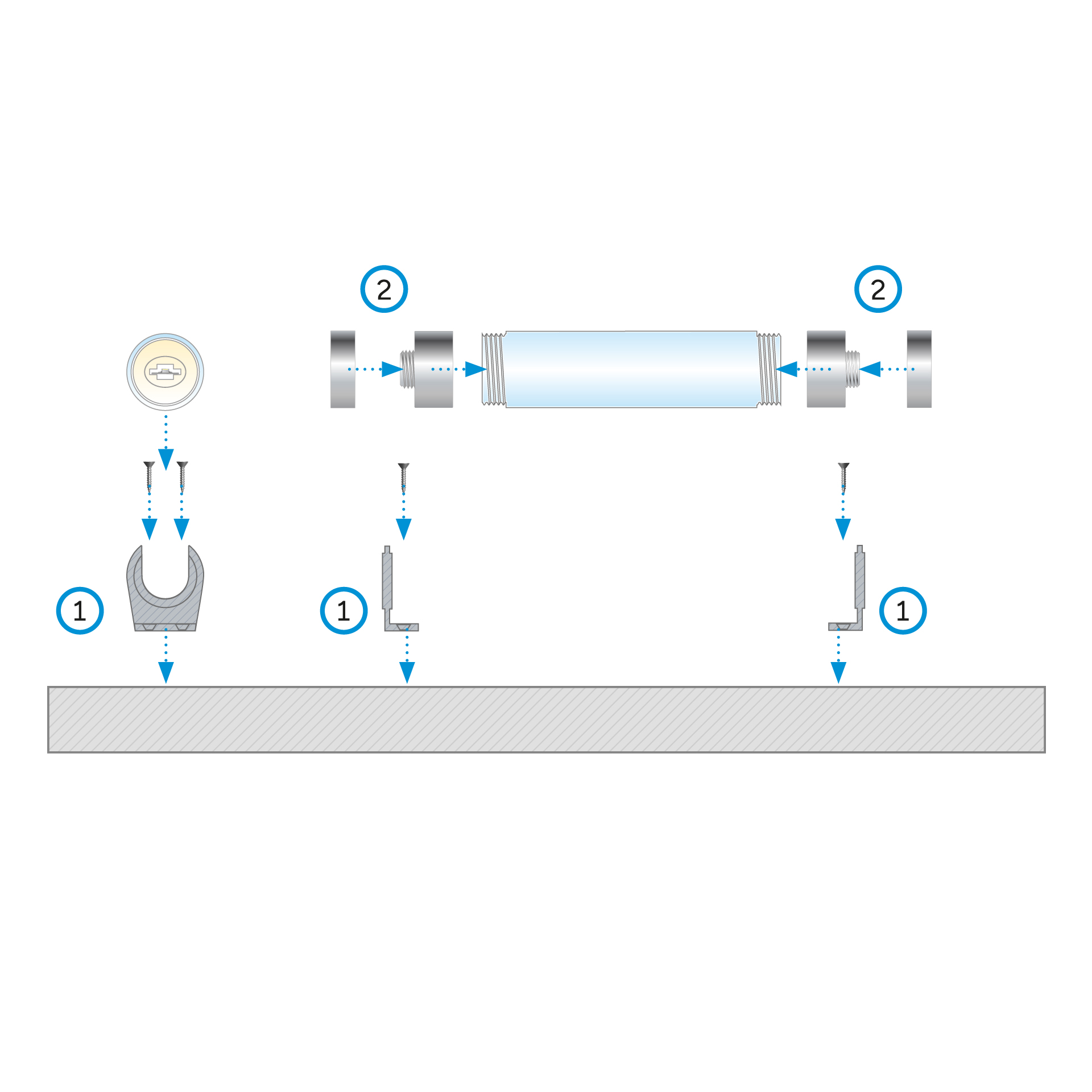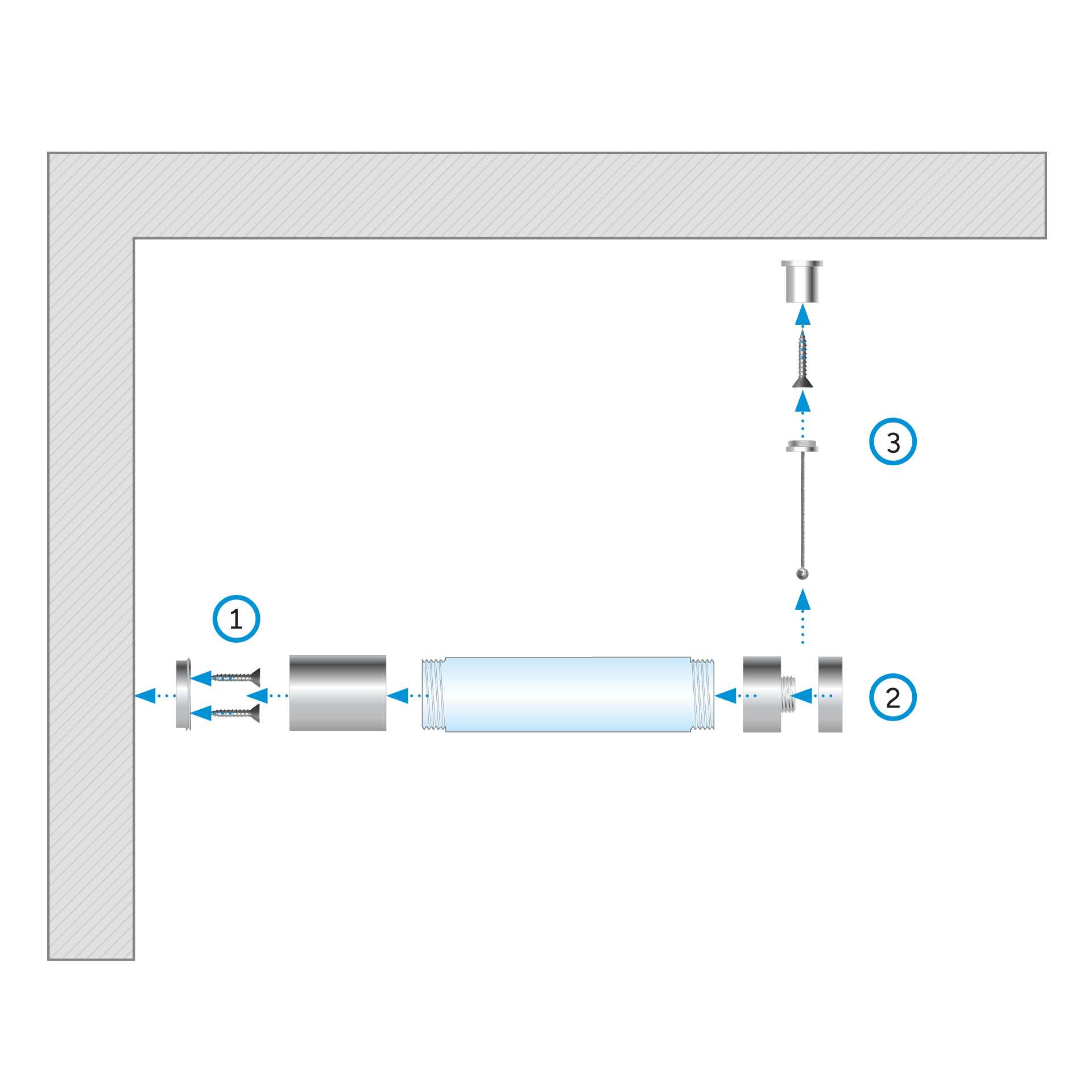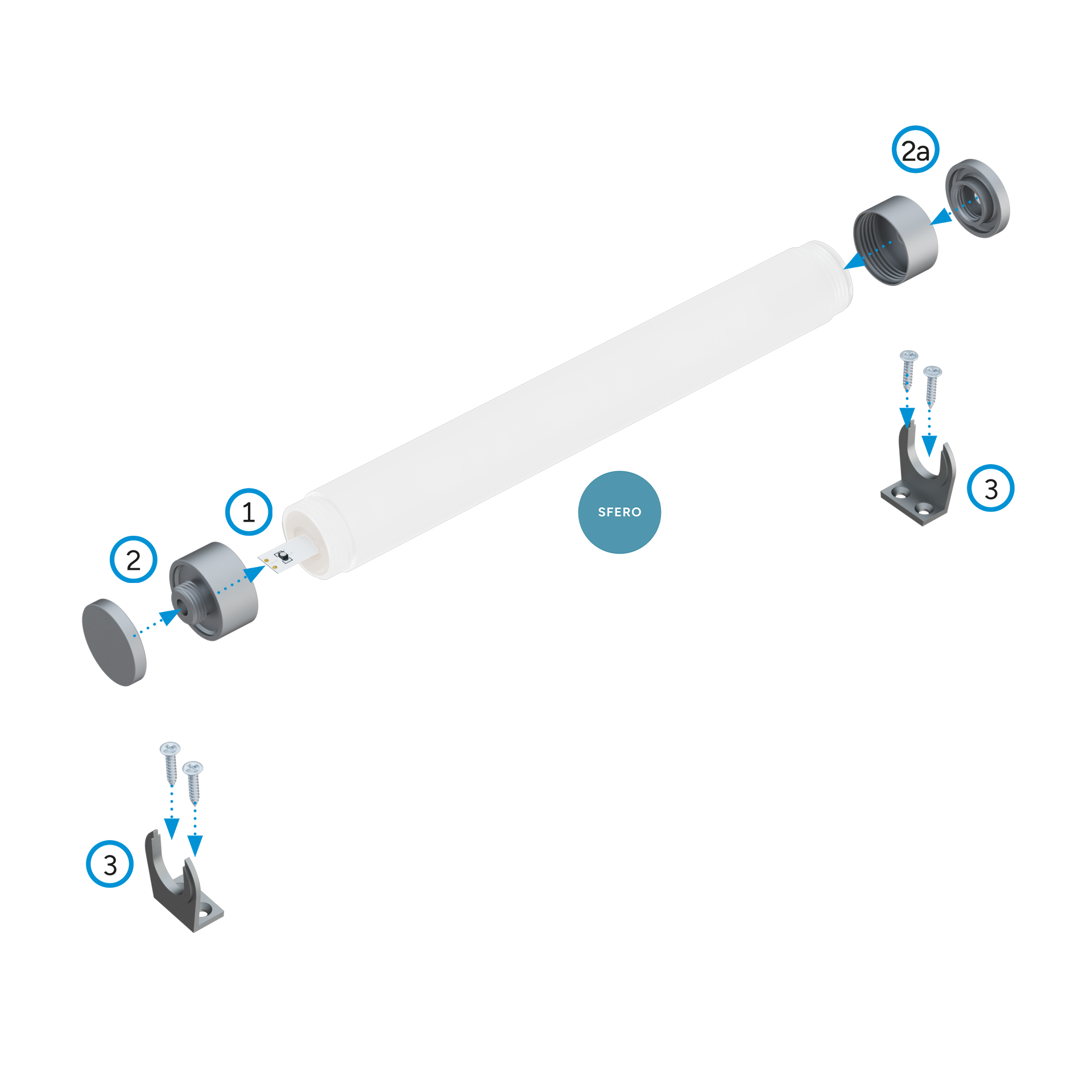 Montageschema des Beleuchtungssystems unter Verwendung des SFERO LED-Profils sowie: (1) SFERO FLEX Lichtquelle, (2) zweiteilige SFERO MS2 Endkappen ohne Öffnung, (3) SFERO MS2 Metallhalterungen.