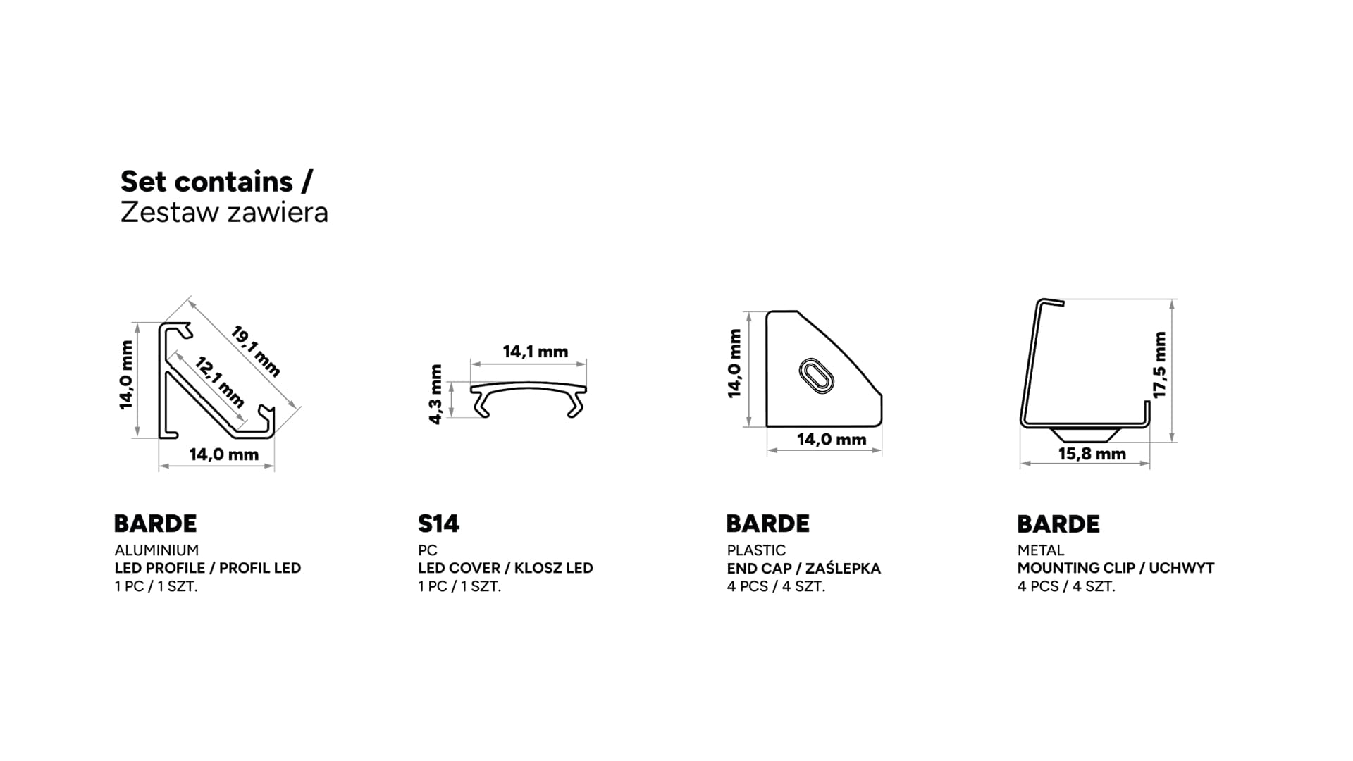 Lieferumfang: 1 × LED-Profil BARDE, 1 × LED-Abdeckung S14, 4 × Endkappe BARDE, 4 × Montagehalter BARDE