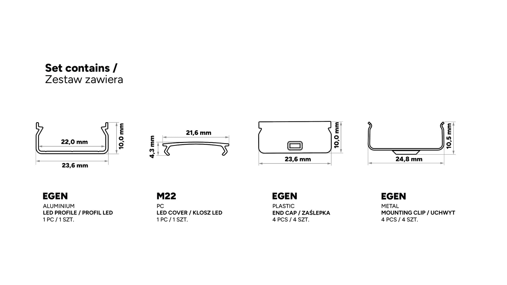 Lieferumfang: 1 × LED-Profil EGEN, 1 × LED-Abdeckung M22, 4 × Endkappe EGEN, 4 × Montagehalter EGEN