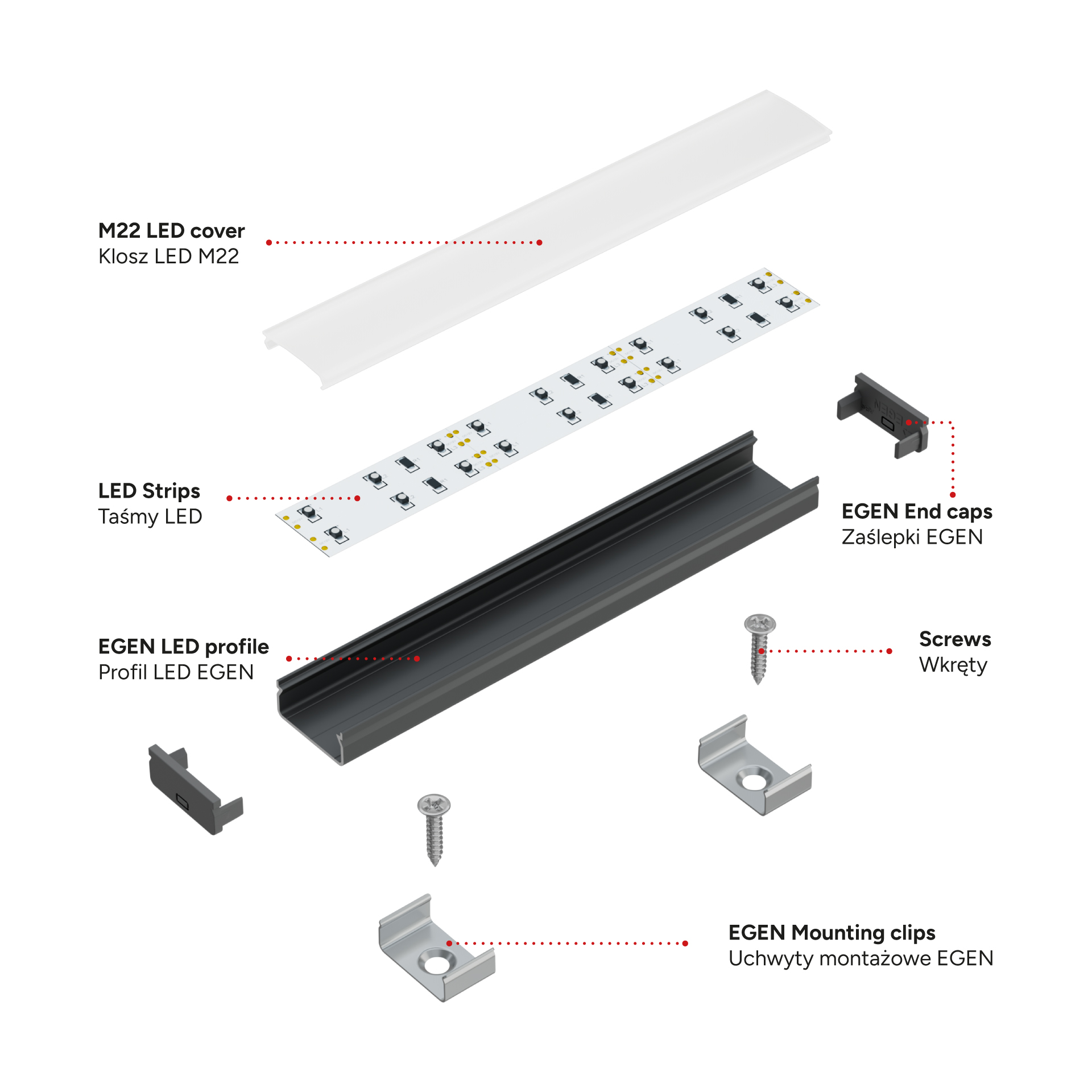 Lieferumfang: 1 × LED-Profil EGEN, 1 × LED-Abdeckung M22, 4 × Endkappe EGEN, 4 × Montagehalter EGEN