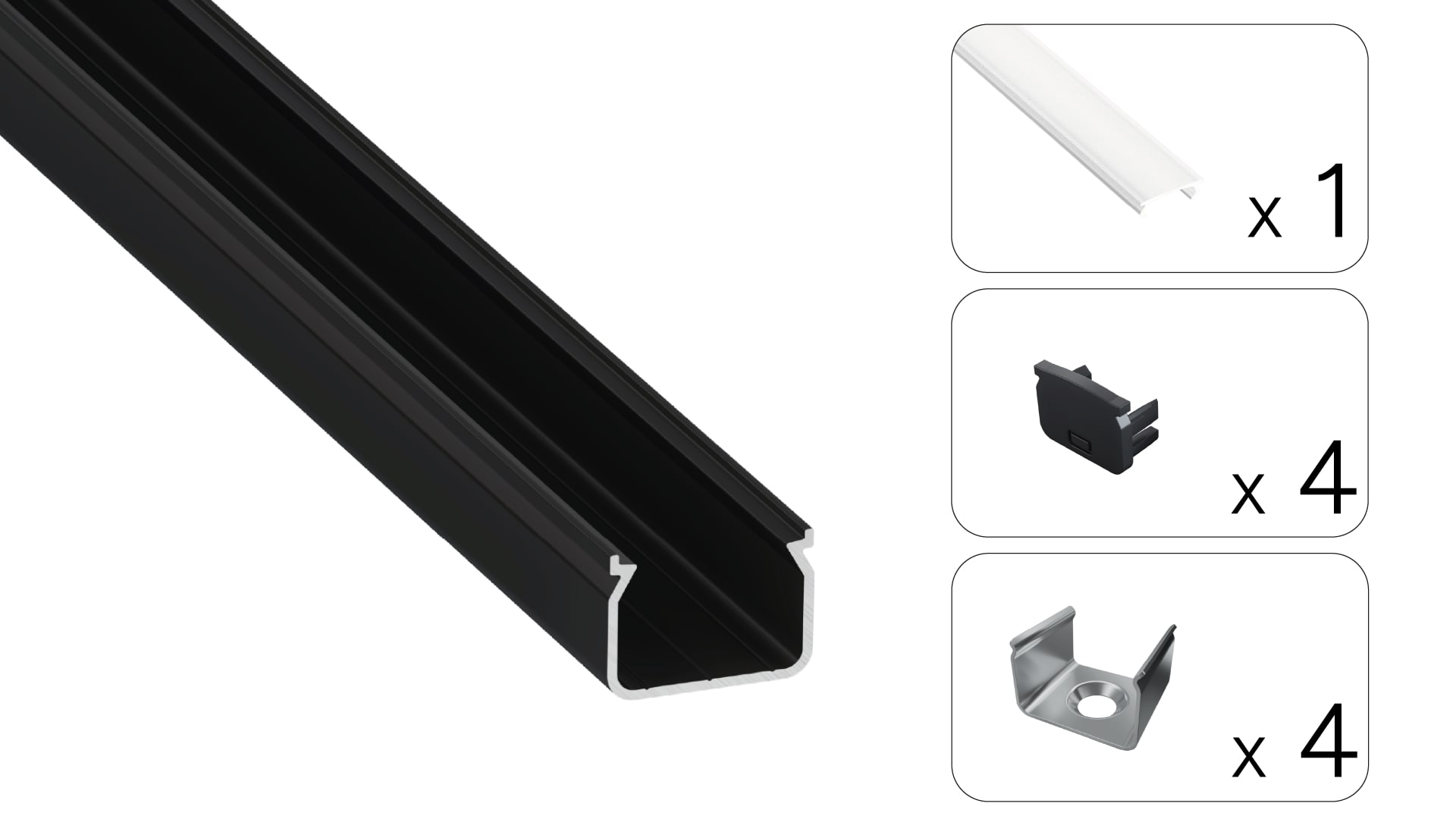 Lieferumfang: 1 × LED-Profil HOM, 1 × LED-Abdeckung S14, 4 × Endkappe HOM, 4 × Montagehalter HOM