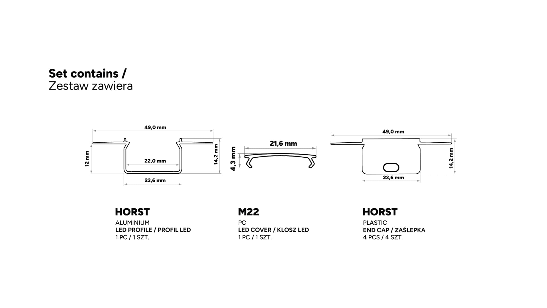 Lieferumfang: 1 × LED-Profil HORST, 1 × LED-Abdeckung M22, 4 × Endkappe HORST