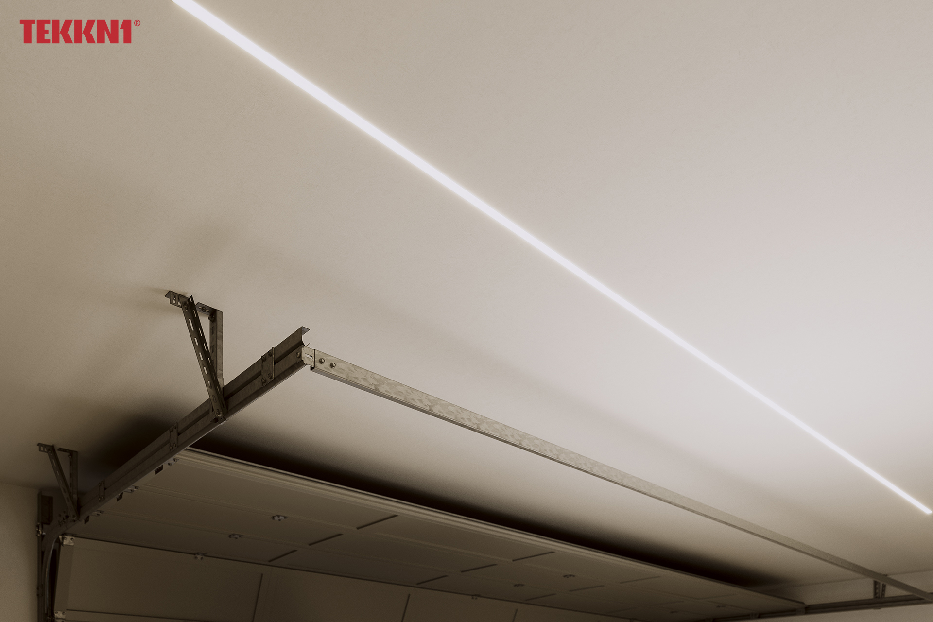 Zweistreifiges LED-Profil zur Integration in Gipskartonplatten. Die Spachtelmasse dringt durch die Perforationen in den Flanschen ein und gewährleistet so eine schnelle, problemlose und dauerhafte Montage.