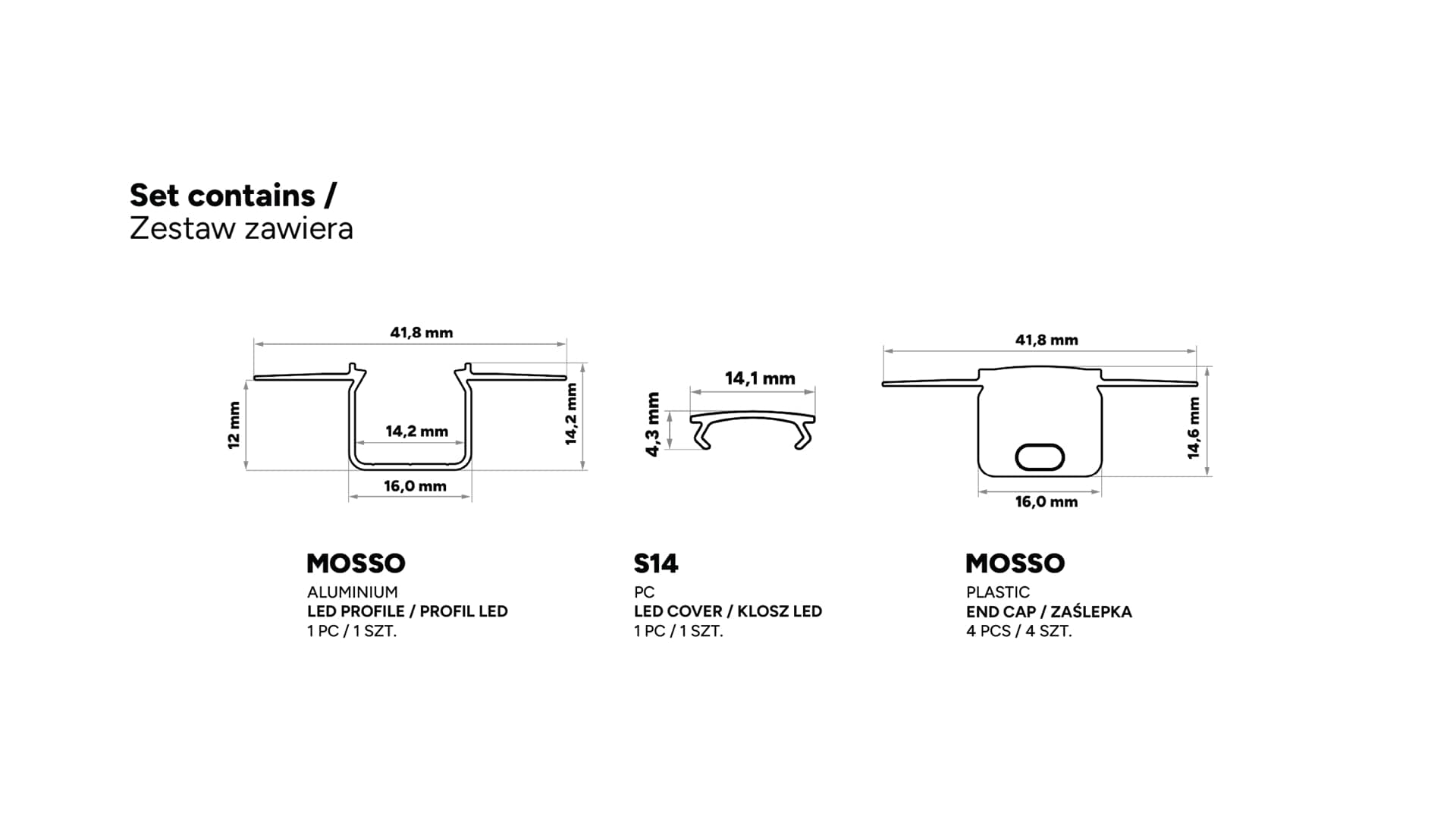 Lieferumfang: 1 × LED-Profil MOSSO, 1 × LED-Abdeckung S14, 4 × Endkappe MOSSO