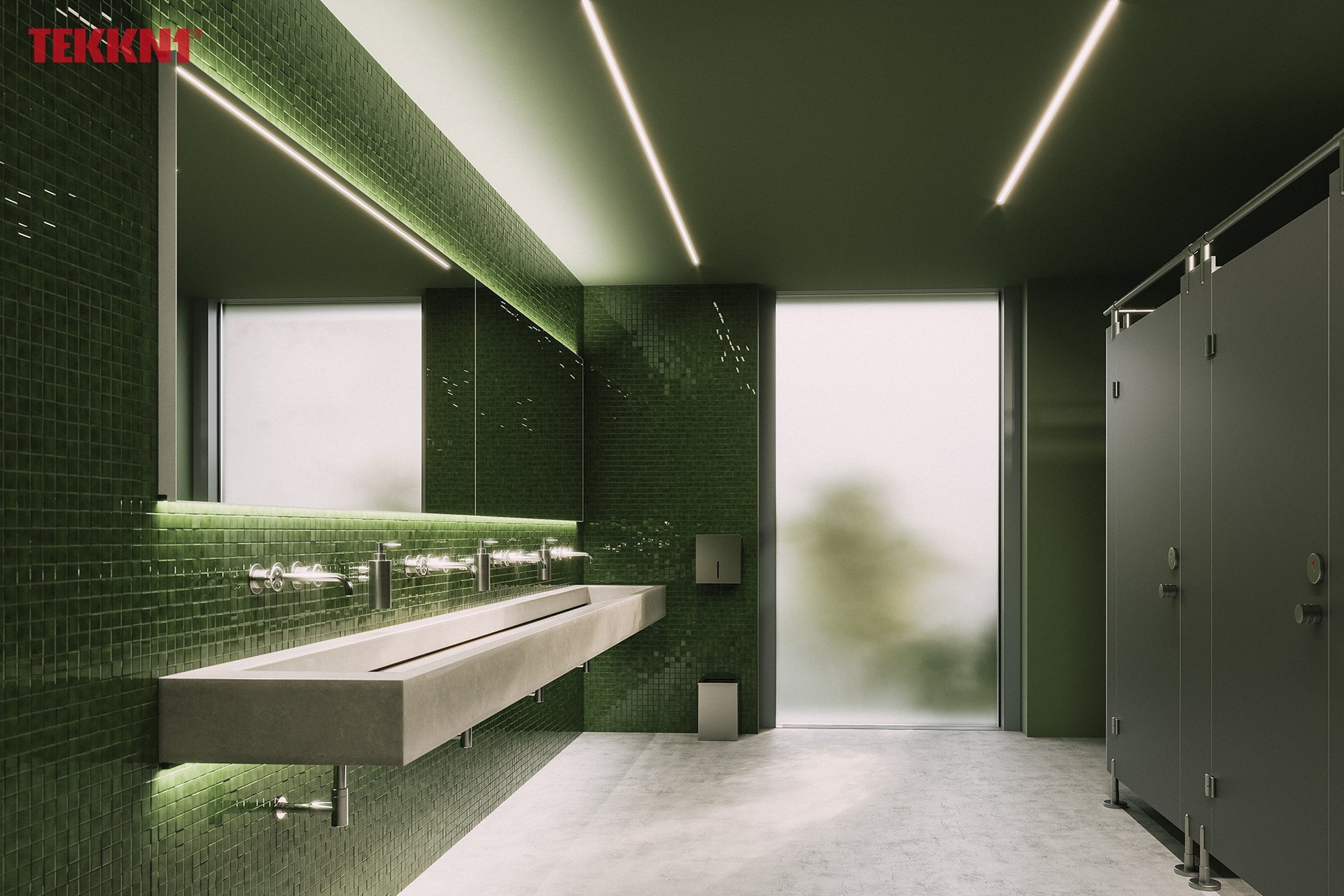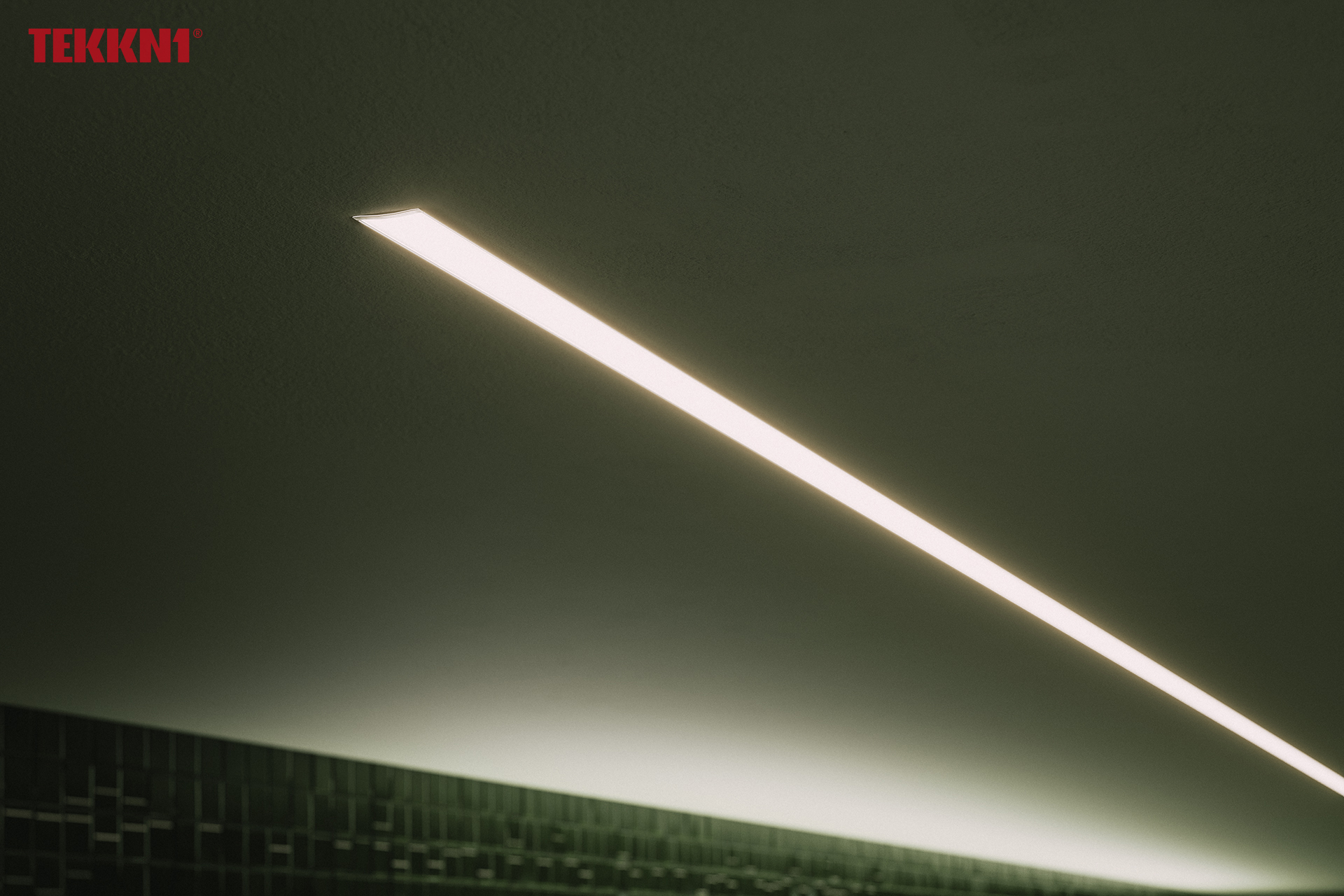 Einspuriges LED-Profil zur Integration in Gipskartonplatten. Die Spachtelmasse dringt durch die Perforationen in den Flanschen ein und gewährleistet so eine schnelle, problemlose und dauerhafte Montage.
