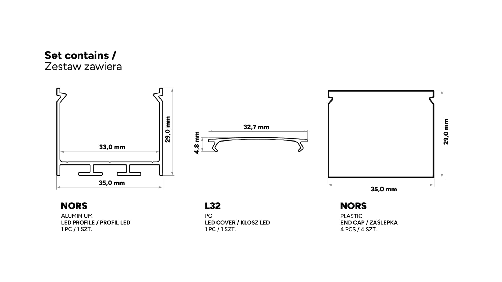 Lieferumfang: 1 × LED-Profil NORS, 1 × LED-Abdeckung L32, 4 × Endkappe NORS