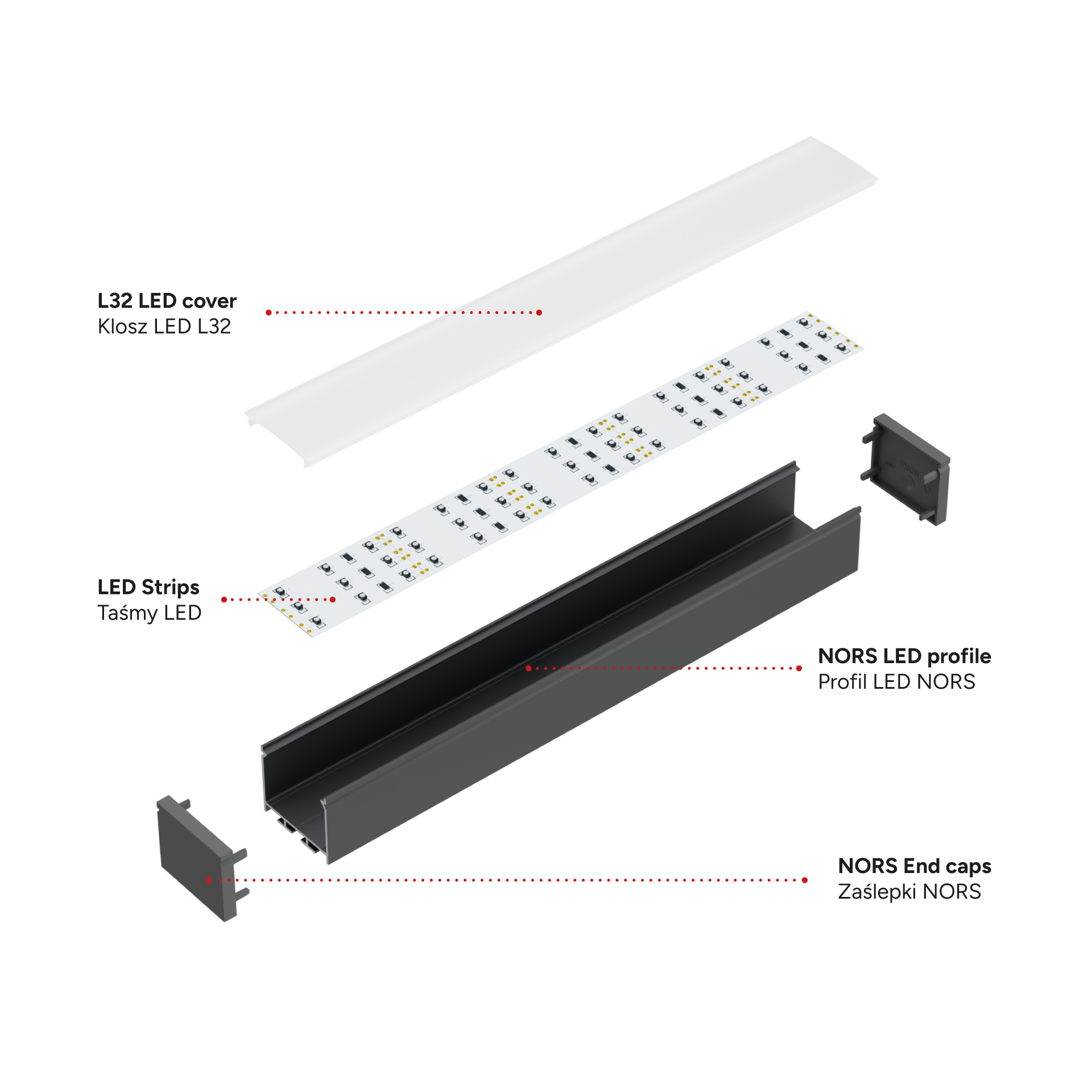 Lieferumfang: 1 × LED-Profil NORS, 1 × LED-Abdeckung L32, 4 × Endkappe NORS