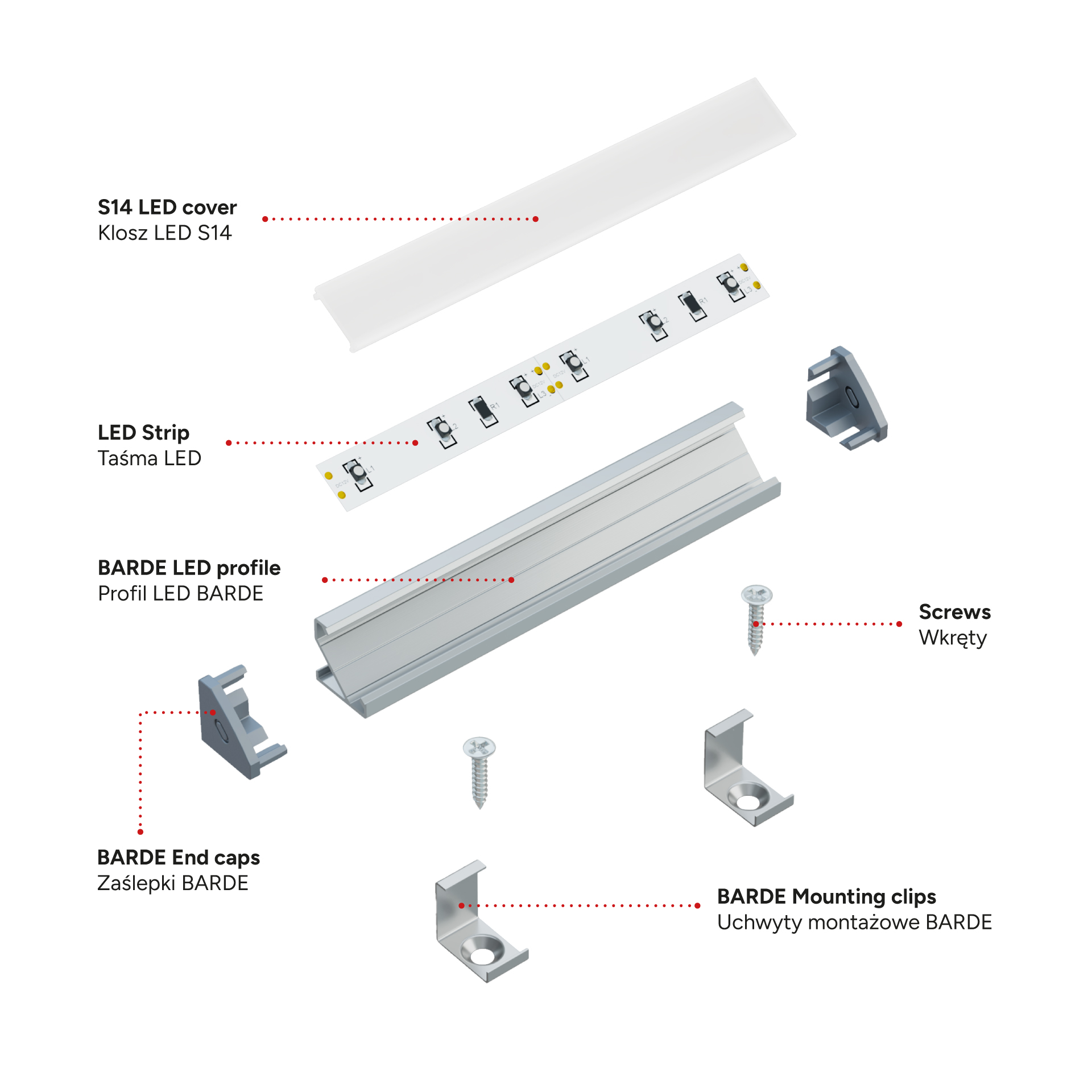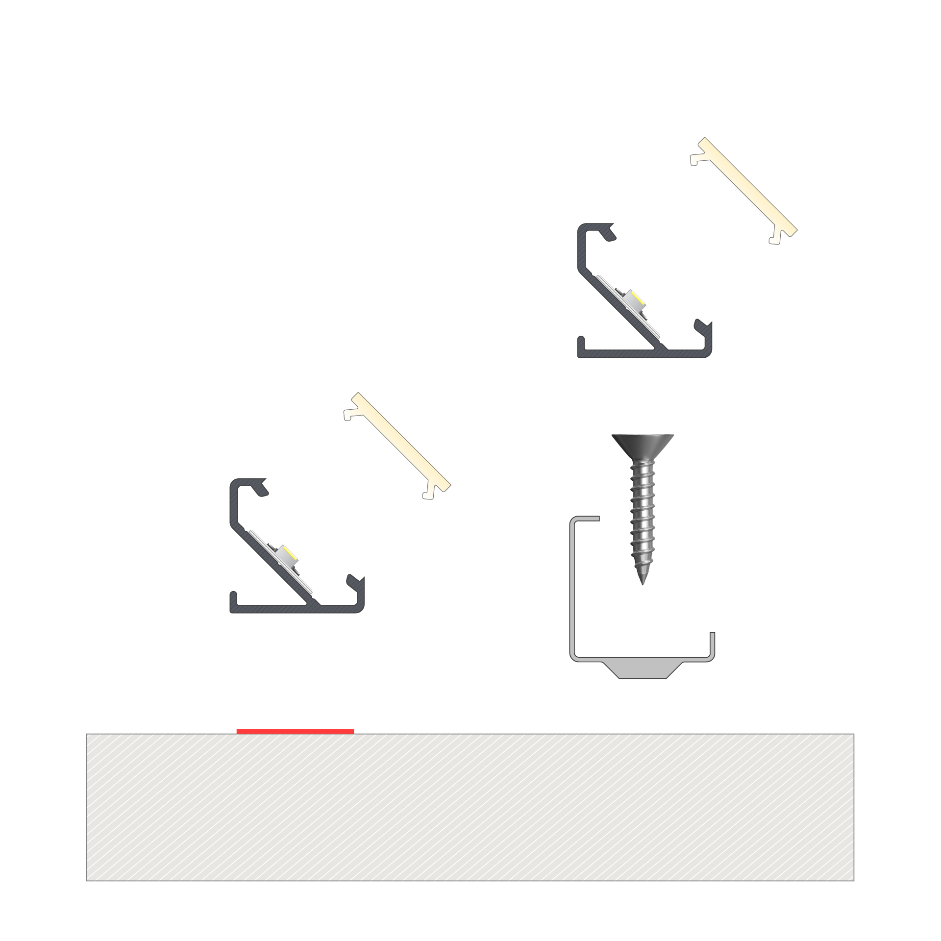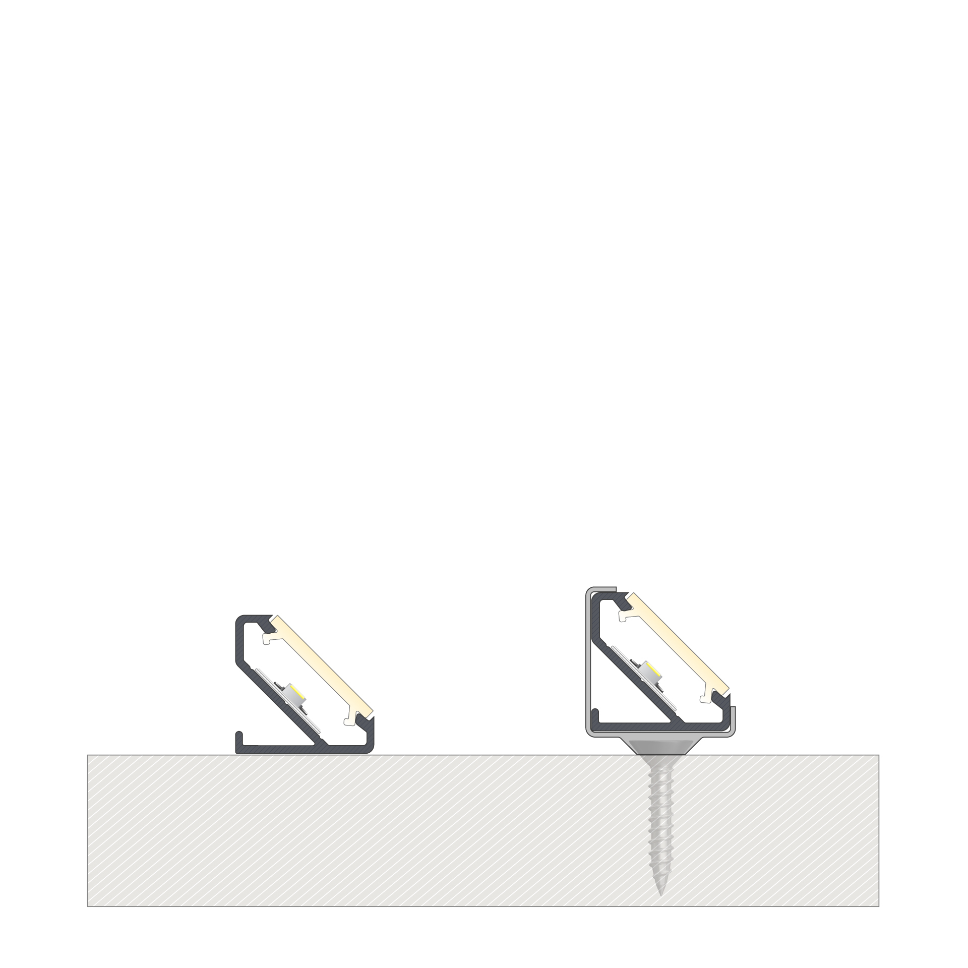LED-Winkelprofil 45° für Anwendungen in Küchen und Ausstellungsbereichen. Eingesetzt zur Beleuchtung von Schränken, Arbeitsplatten und anderen Arbeitsflächen.