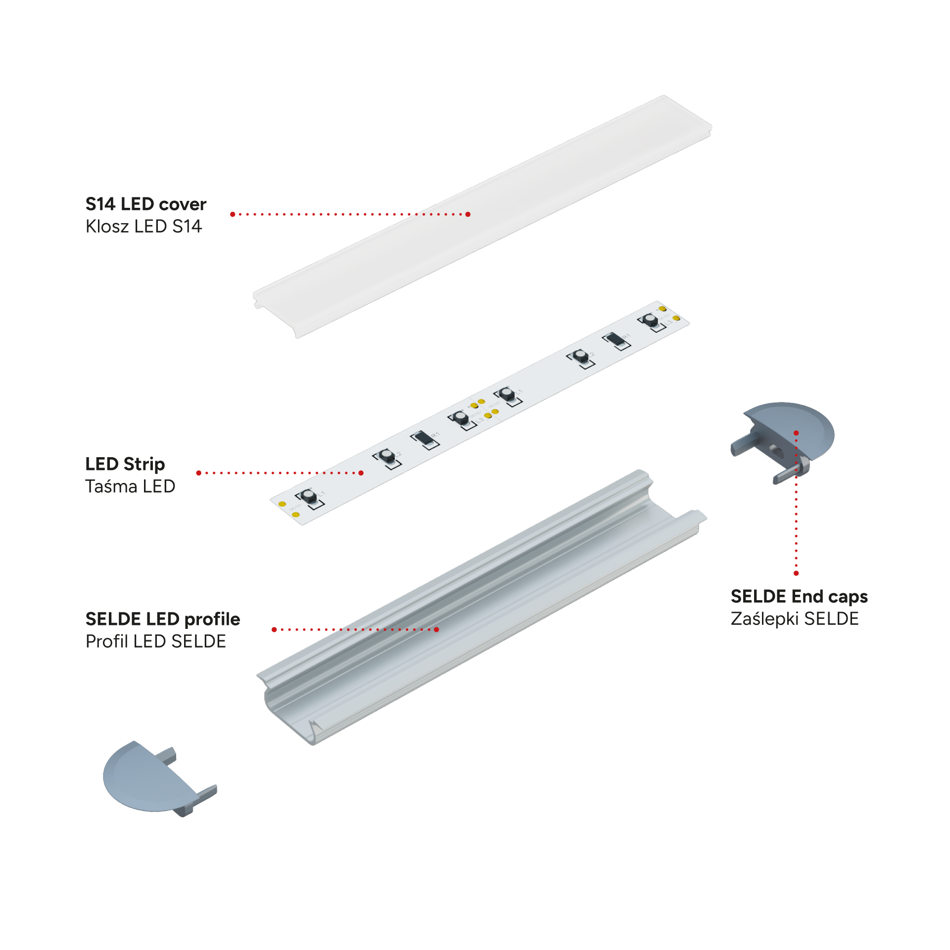 Lieferumfang: 1 × LED-Profil SELDE, 1 × LED-Abdeckung S14, 4 × Endkappe SELDE