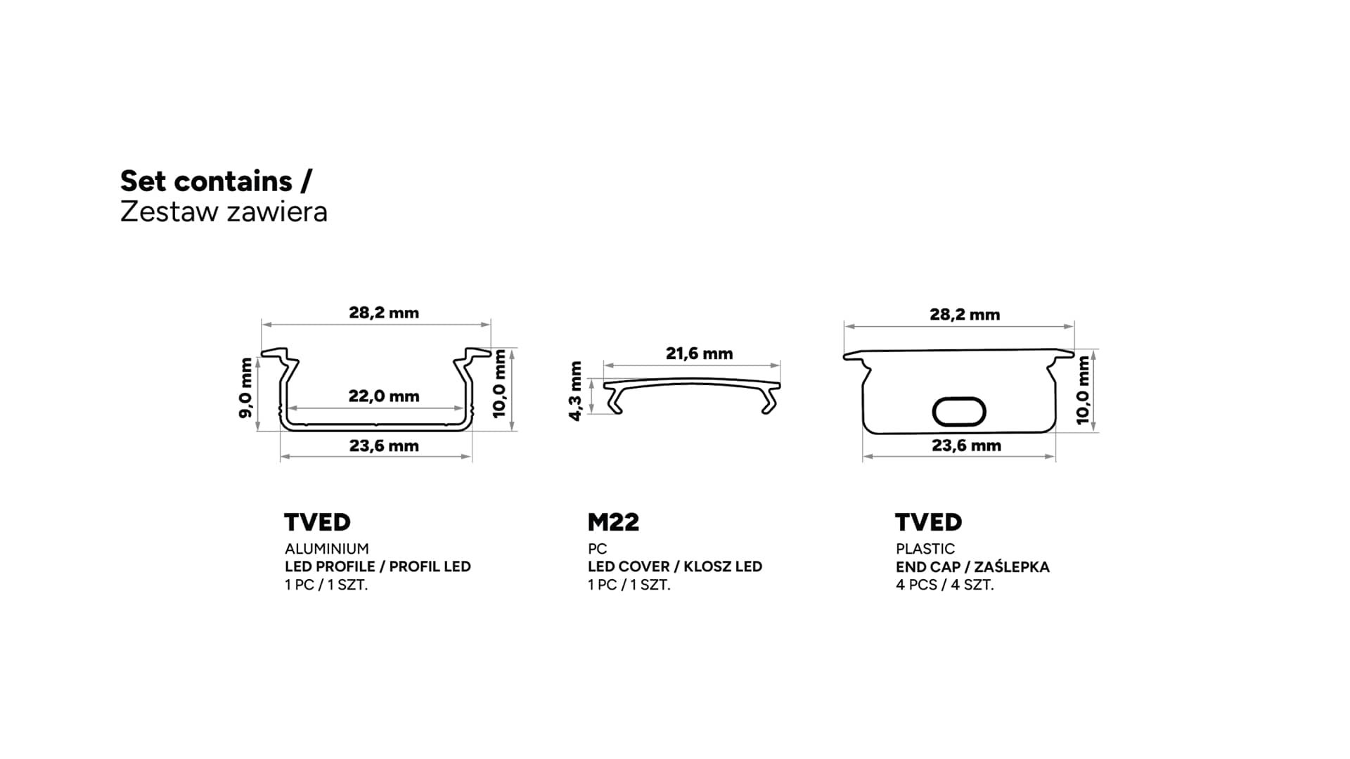 Lieferumfang: 1 × LED-Profil TVED, 1 × LED-Abdeckung M22, 4 × Endkappe TVED